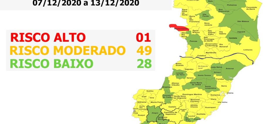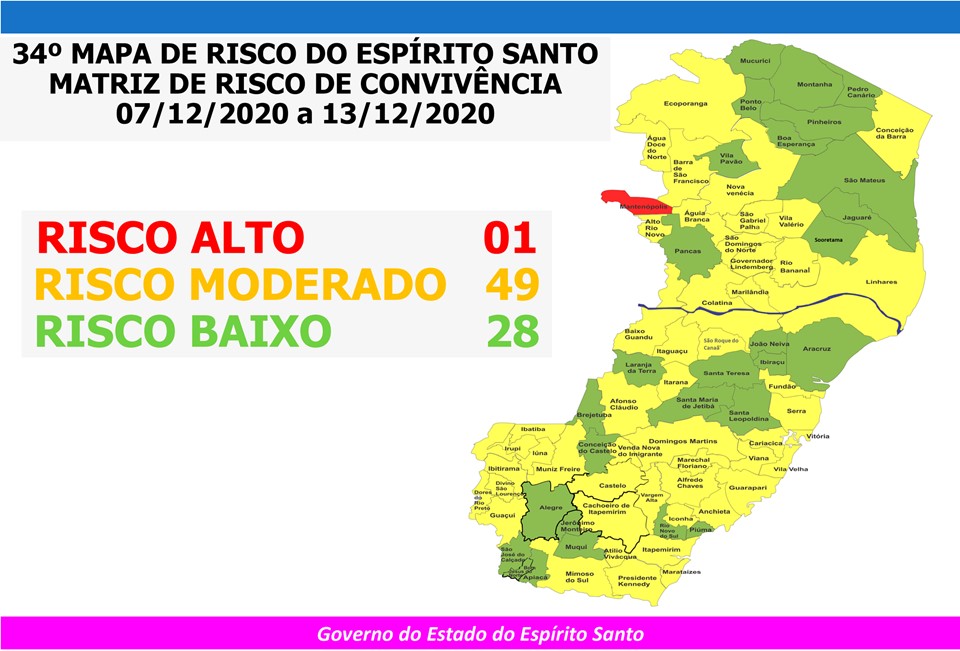 O Governo do Estado do Espírito Santo anunciou, nesta sexta-feira (04), o 34º Mapa de Risco Covid-19, que terá vigência entre a próxima segunda-feira (07) e o domingo (13). Dos 78 municípios capixabas, 28 estão classificados em Risco Baixo e 49 estão em Risco Moderado. Somente o município de Mantenópolis está classificado como Risco Alto.