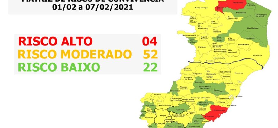 O Governo do Estado do Espírito Santo anunciou, nesta sexta-feira (29), o 42º Mapa de Risco Covid-19, que terá vigência entre a próxima segunda-feira (1º) e o domingo (07). Dos 78 municípios capixabas, 22 estão classificados em Risco Baixo e 52 estão em Risco Moderado. Somente quatro municípios (Anchieta, Guarapari, Montanha e Ponto Belo) estão classificados como Risco Alto.