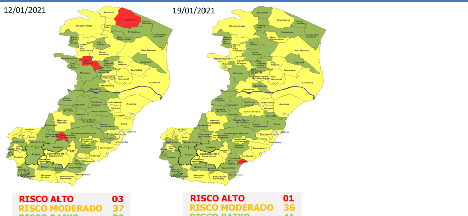 O Governo do Estado do Espírito Santo anunciou, nesta sexta-feira (19), o 45º Mapa de Risco Covid-19, que terá vigência a partir desta segunda-feira (22) até o próximo domingo (28). Dos 78 municípios capixabas, 41 estão classificados em Risco Baixo e 36 estão em Risco Moderado. Somente o município de Piúma está classificados como Risco Alto.
