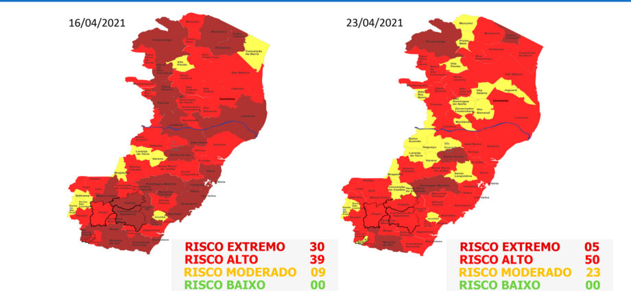 A Matriz de Risco de Convivência considera no eixo de ameaça: o coeficiente de casos ativos por município dos últimos 28 dias, além da quantidade de testes realizados por grupo de mil habitantes e a média móvel de óbitos dos últimos 14 dias. Já o eixo de vulnerabilidade considera a taxa de ocupação de leitos potenciais de UTI exclusivos para tratamento da Covid-19, isto é, a disponibilidade máxima de leitos para tratamento da doença. A estratégia de mapeamento de risco teve início em abril do ano passado.
