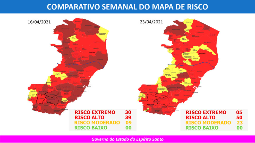 O Governo do Estado do Espírito Santo anunciou, nesta sexta-feira (23), o 52º Mapa de Risco Covid-19, que terá vigência desta segunda-feira (26) até o próximo domingo (02). Dos 78 municípios capixabas, 50 estão classificados em Risco Alto e 23 em Risco Moderado. Cinco municípios (Domingos Martins, Ecoporanga, Mimoso do Sul, Pedro Canário e Santa Teresa) seguem em Risco Extremo. Não há municípios classificados em Risco Baixo.