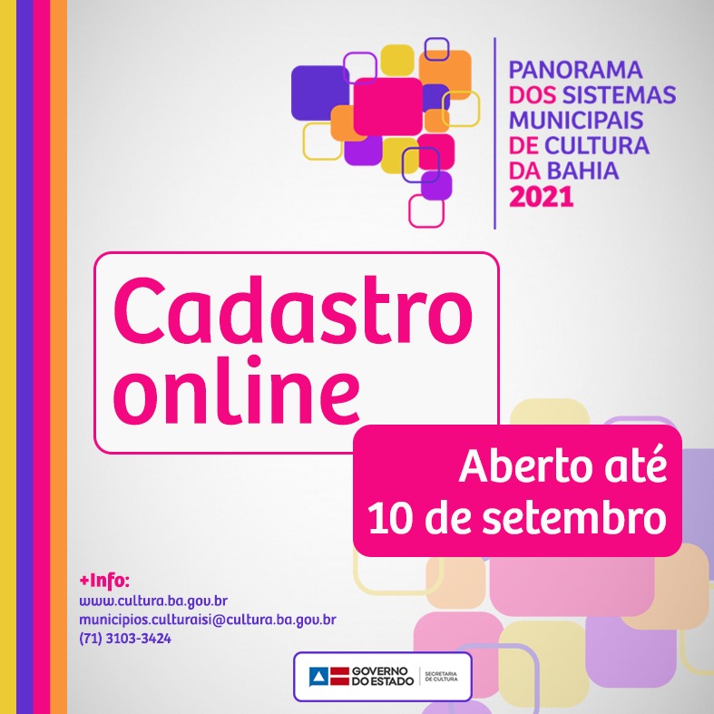 A Secretaria de Cultura do Estado da Bahia (SecultBA) disponibiliza formulário para cadastro de informações do Panorama dos Sistemas Municipais de Cultura da Bahia 2021, que tem como objetivo mapear as instâncias e instrumentos de gestão da cultura nos 417 municípios do Estado. O formulário online deve ser preenchido pelos dirigentes municipais de cultura até o dia 10 de setembro de 2021. Para ter acesso ao formulário, clique aqui.