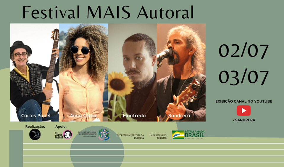 O Festival MAIS Autoral é uma forma de resistência do artista autoral independente que se propõe caminhar com sua música. Focado em seu trabalho autoral, Sandrera convidou para o evento, que será gravado no Palácio da Cultura Sônia Cabral, em Vitória, diferentes gerações da música capixaba. O encontro será transmitido on-line, nos dias 02 e 03 de julho, no canal do músico Sandrera no YouTube.