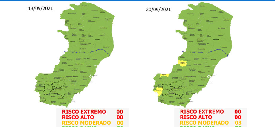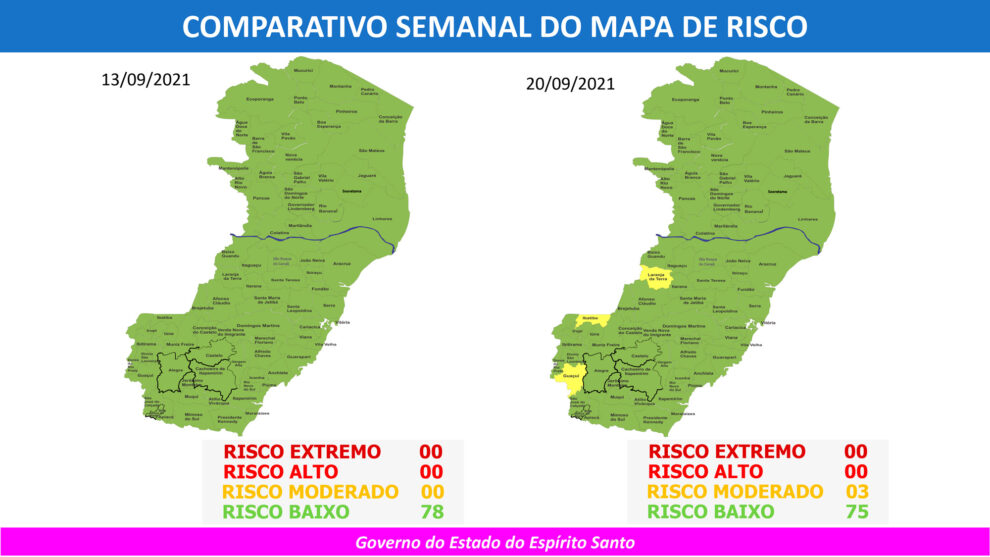 O Governo do Estado anunciou, nesta sexta-feira (17), o 73º Mapa de Risco Covid-19, que terá vigência desta segunda-feira (20) até o próximo domingo (26). Dos 78 municípios capixabas, 75 estão classificados em Risco Baixo e somente três (Guaçuí, Ibatiba e Laranja da Terra) em Risco Moderado.