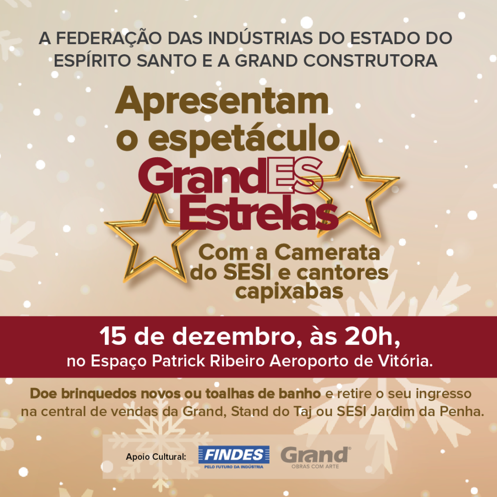 A Findes e a Grand Construtora convidam o público para o show natalino GrandEStrelas, no dia 15 de dezembro, às 20h, no Espaço Patrick Ribeiro Produções.