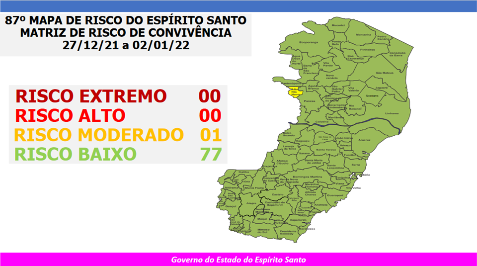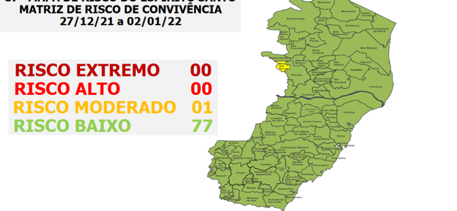 O Governo do Estado do Espírito Santo anunciou, nesta sexta-feira (24), o 87º Mapa de Risco Covid-19, que terá vigência desta segunda-feira (27) até o próximo domingo (02). Dos 78 municípios capixabas, 77 seguem classificados em Risco Baixo e somente um (Alto Rio Novo) está em Risco Moderado. Não há municípios em Risco Alto. Até o momento, nenhuma microrregião conseguiu atingir os três índices para a classificação de Risco Muito Baixo.