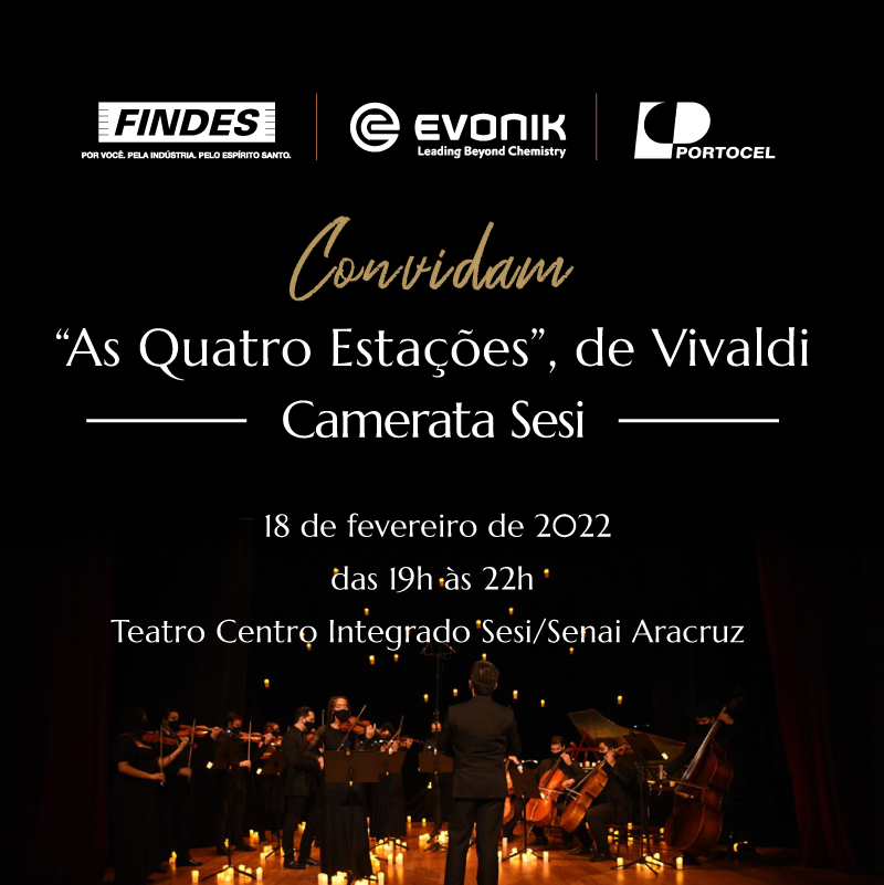 O concerto é fruto da parceria entre a Findes e as empresas Evonik e Portocel, de Aracruz. Para assistir ao concerto é obrigatório o uso de máscara e a apresentação do certificado de vacinação contra a covid-19 atualizado com as duas doses.