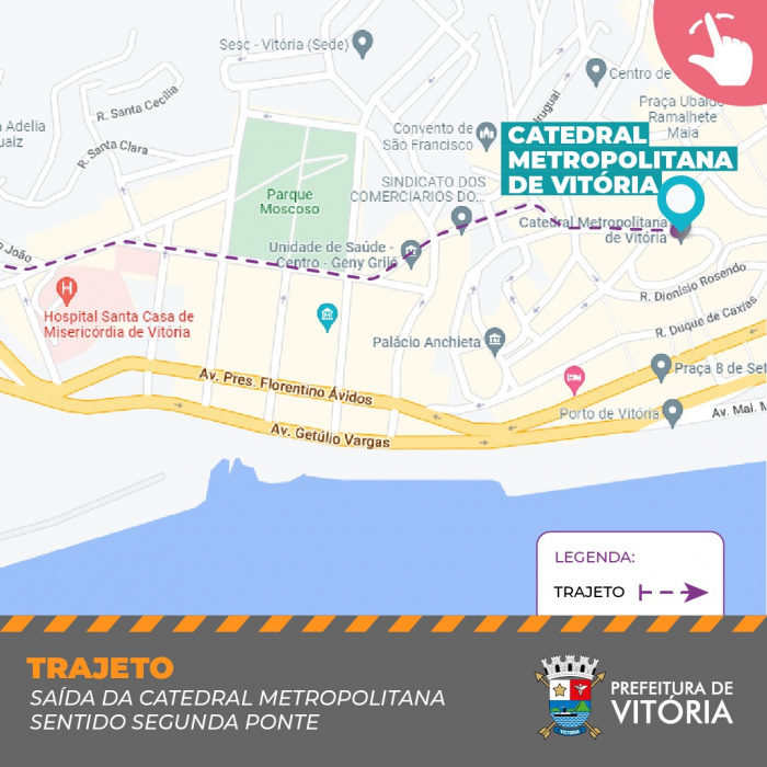 A saída é da Catedral Metropolitana, às 19 horas, passando por baixo do Viaduto Caramuru, sentido Parque Moscoso, Vila Rubim, rodoviária e Segunda Ponte.