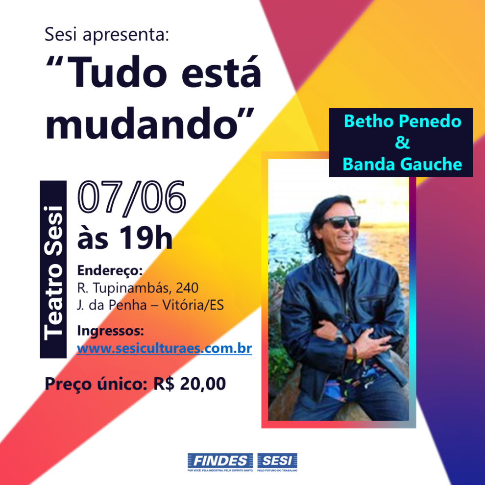 O Teatro Sesi será palco para mais uma apresentação especial! Com o intuito de movimentar a cultura capixaba, o Sesi Cultura organizou um show poético musical com Betho Penedo & Banda Gauche, na turnê “Tudo está mudando”.