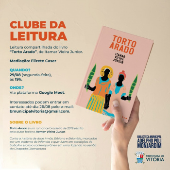 Desta vez, a reunião ocorre no próximo dia 29, a partir das 19 horas, via Google Meet, e compartilhará a leitura do livro “Torto Arado” de Itamar Vieira Junior.