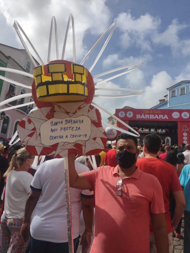 Adilson Guedes, 57 anos, devoto desde criança, quando era levado para a festa pela mãe, que hoje não pode mais participar presencialmente, chamava atenção portando durante toda a festa um estandarte confeccionado por ele próprio com material reciclado, representando a coroa de Santa Bárbara, carregando os dizeres “Salve Santa Bárbara” e “Santa Bárbara, nos proteja contra a Covid-19”. “Neste dia especial, 04 de dezembro, todo ano estou aqui homenageando à nossa Santa Bárbara. Não deixei de participar nos últimos dois anos das missas com acesso restrito mediante agendamento. Esse estandarte eu criei pedindo a proteção pelo fim da Covid e para abrilhantar até mais as festas. Nesse momento a gente tem que fortalecer a fé”, explica Adilson.