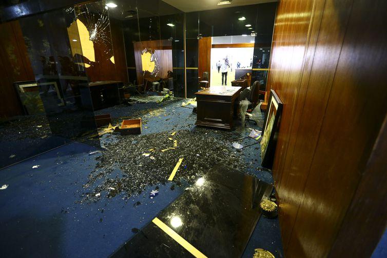 • Galeria dos ex-presidentes — totalmente destruída, com todas as fotografias retiradas da parede, jogadas ao chão e quebradas.