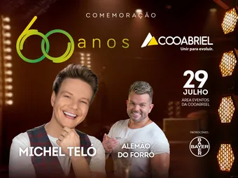 Em virtude do aniversário de 60 anos de sua fundação, a Cooabriel realizará um grande show comemorativo no dia 29 de julho, data em que acontece o terceiro e último dia da Feira de Agronegócios da Cooabriel – 2023.