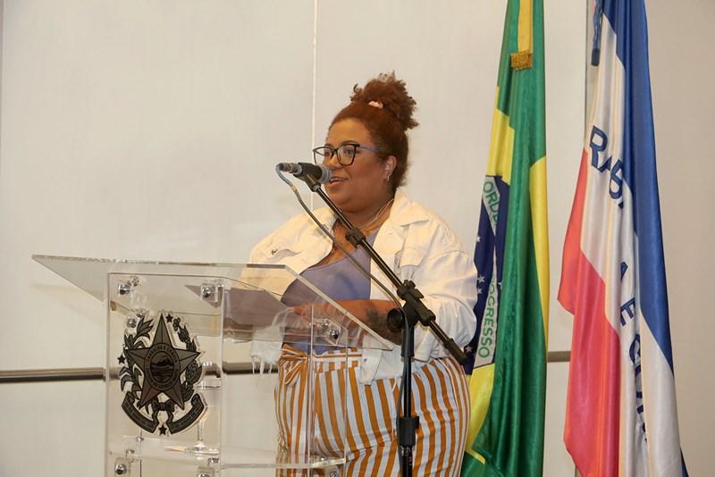 Aisha Santana, que foi uma das primeiras intercambistas do programa, e hoje atua como professora de Língua Inglesa, no Colégio Estadual, em Vitória, falou para os estudantes presentes.