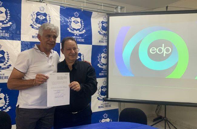 A EDP, distribuidora de energia elétrica do Espírito Santo, deixará a cidade de Muniz Freire mais moderna, eficiente e sustentável com a substituição de 537 pontos de iluminação pública por tecnologia LED, a partir do Programa de Eficiência Energética (PEE) da distribuidora. Na última segunda-feira, 4, o diretor da EDP, Fernando Saliba, se reuniu com o prefeito da cidade, Gesi Antônio da Silva, na sede da prefeitura, para a assinatura simbólica do contrato.